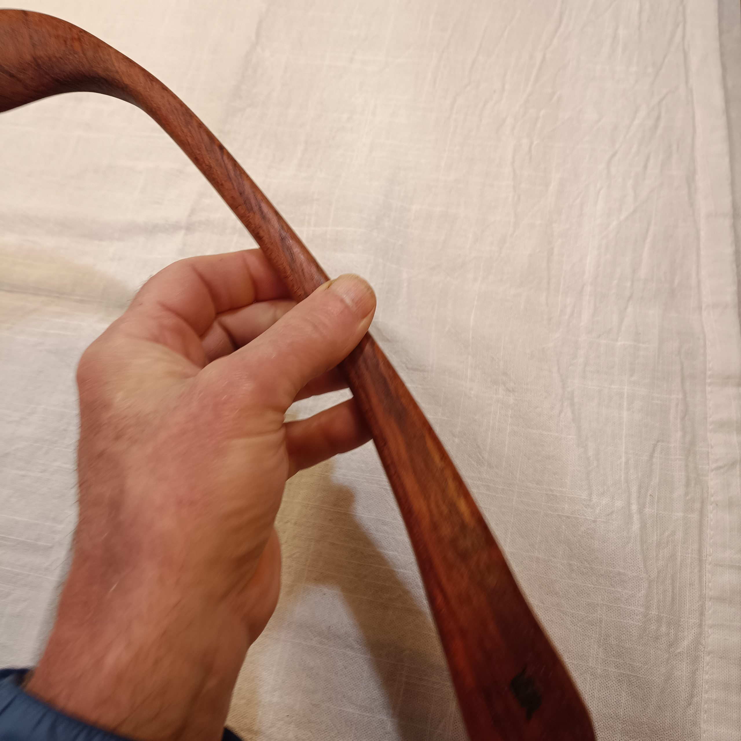 Un egote o throwing stick con curva y palo fino para entrar en piezas con bocas pequeñas. Tallado a mano.